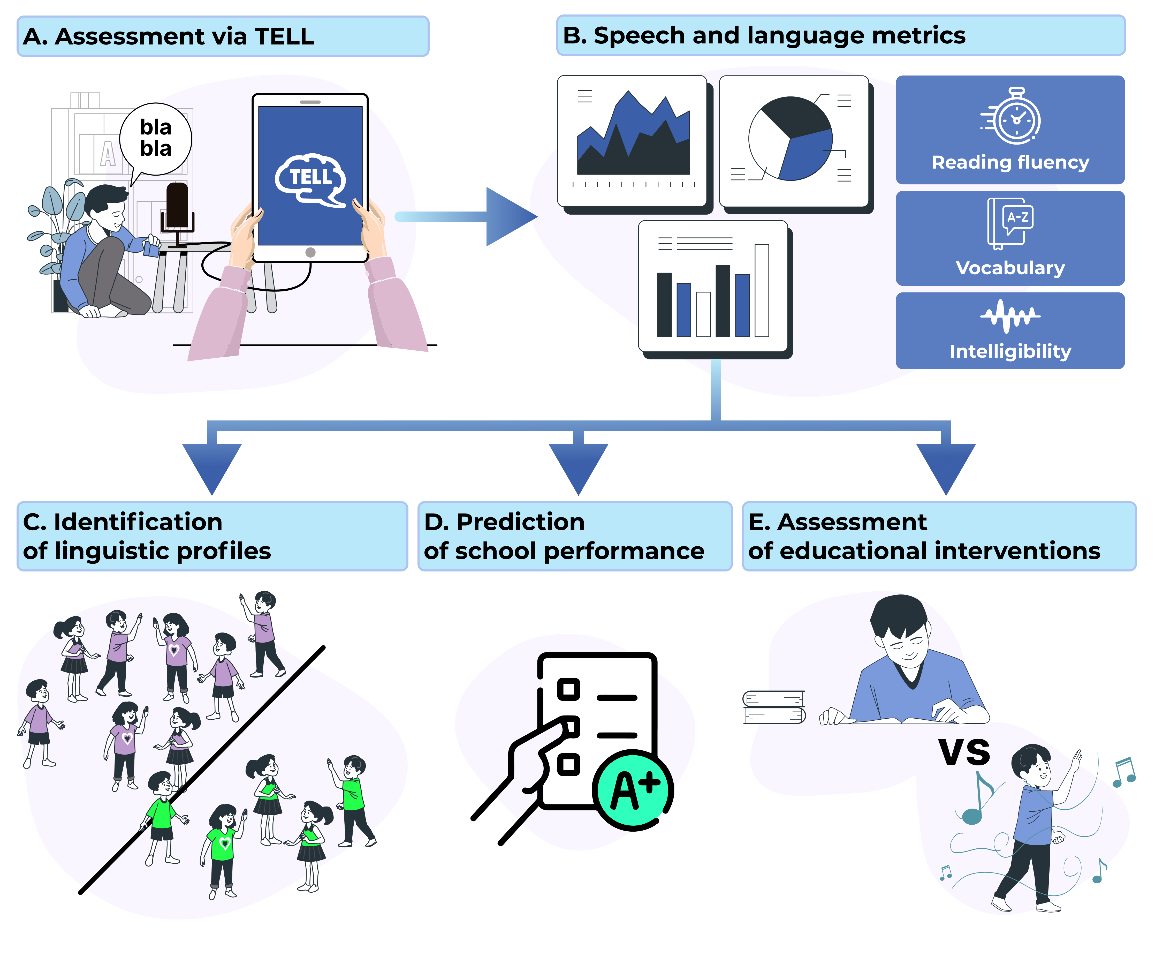 TELL can capture children’s language skills and difficulties, predict school outcomes, and test the efficacy of educational programs